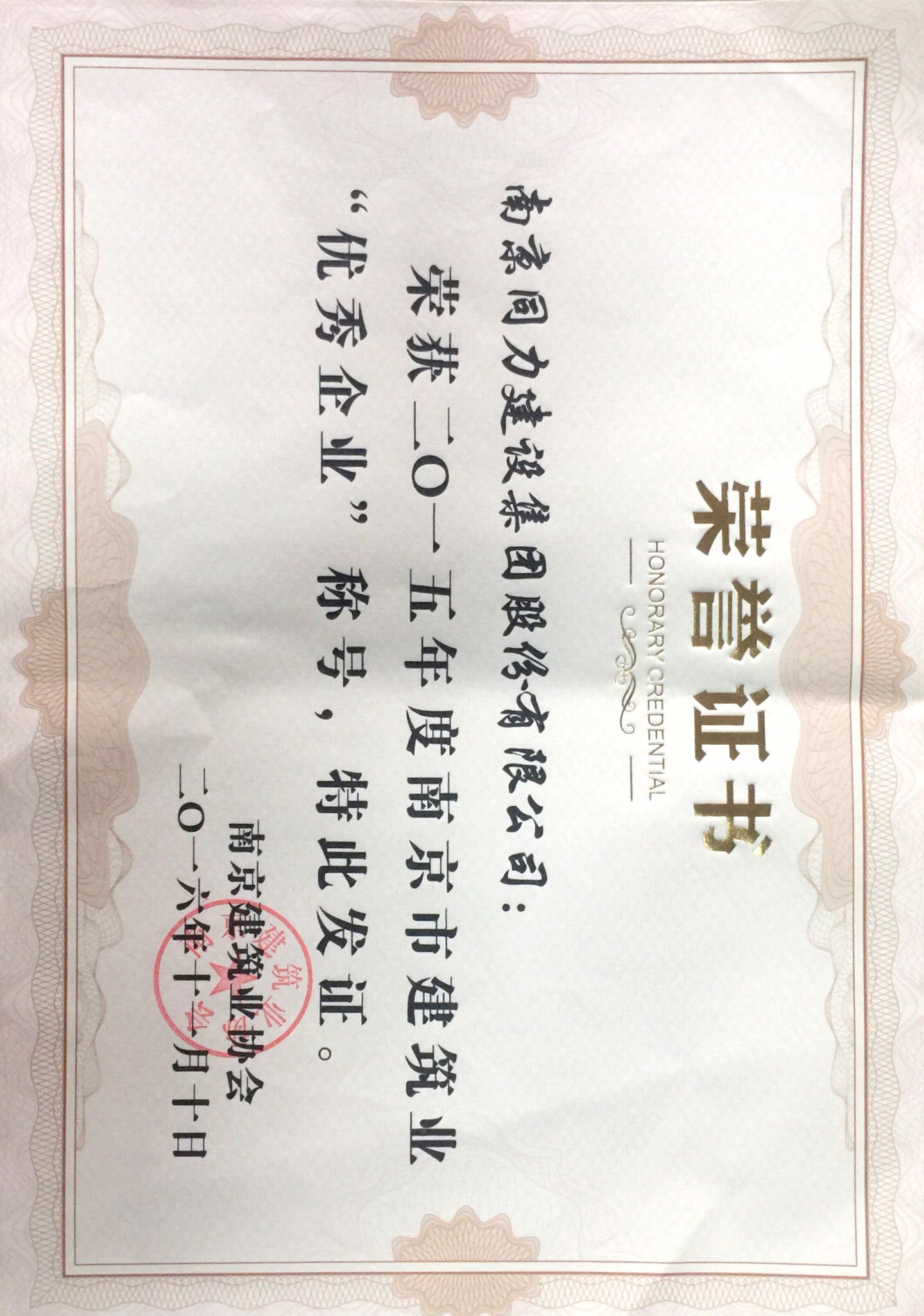 公司獲得《2015年度南京市建筑業(yè)“優(yōu)秀企...