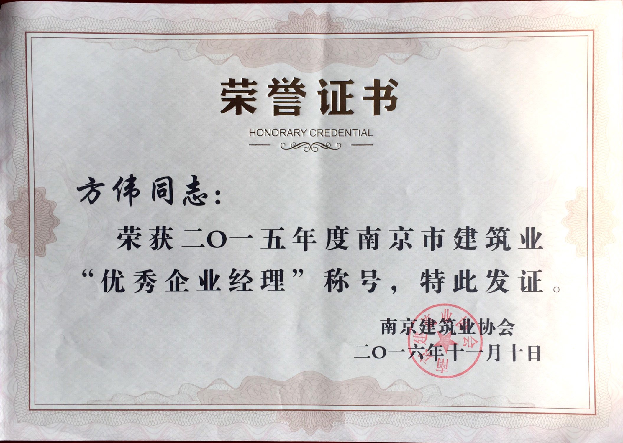 方偉獲得《2015年度南京市建筑業(yè)優(yōu)秀企...