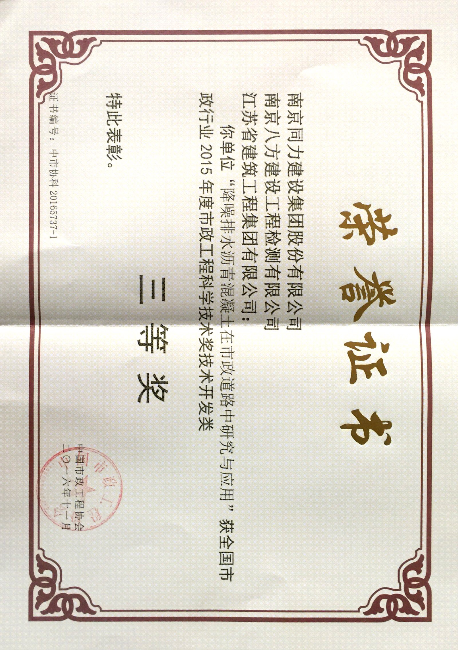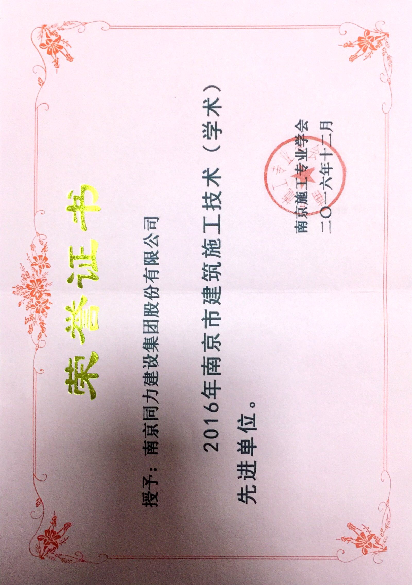 公司獲得《2016年南京市建筑施工技術(學...
