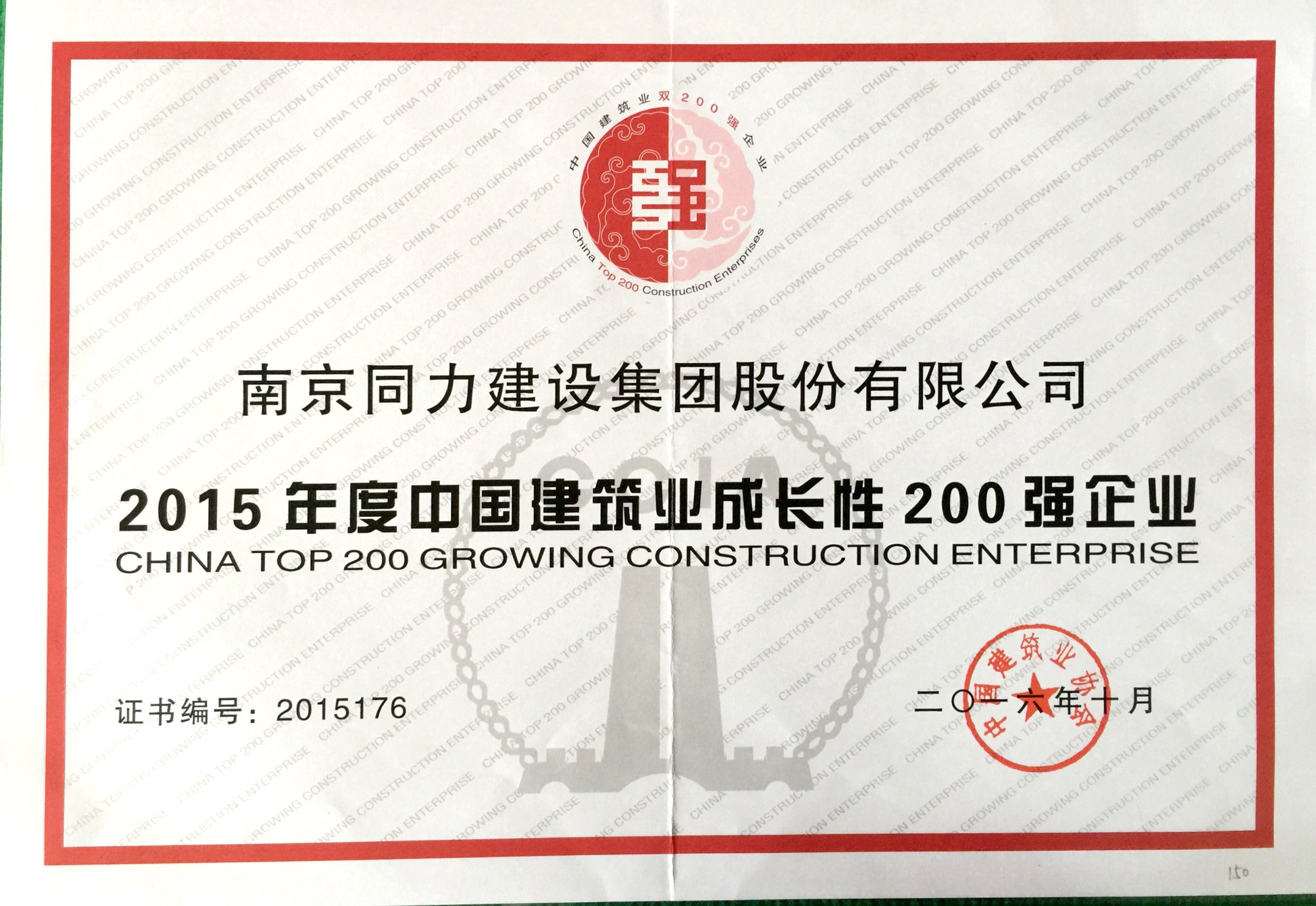 公司獲得《2015年度中國建筑業(yè)成長性20...