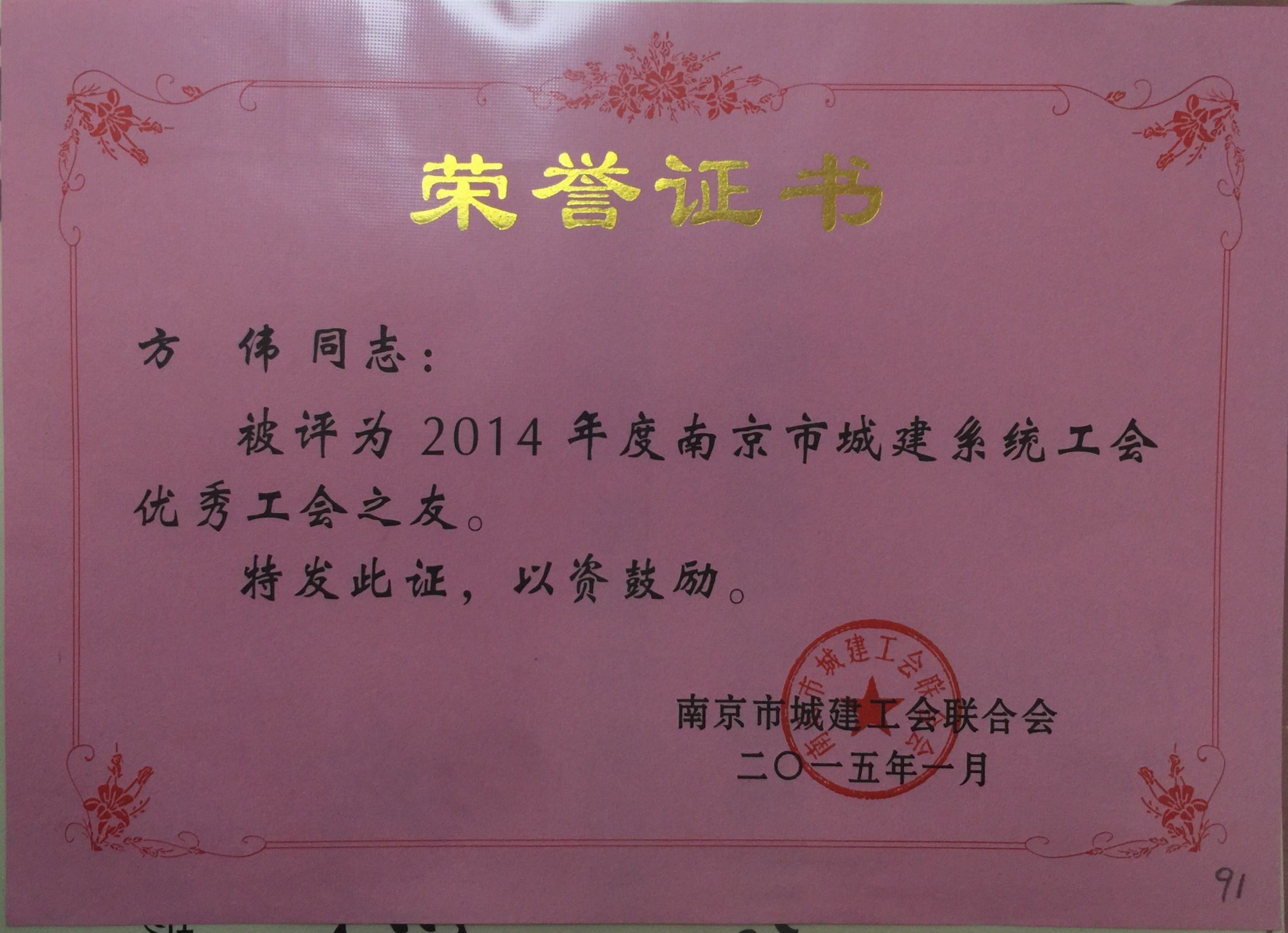 公司方偉被評為2014年度南京市城建系統(tǒng)...