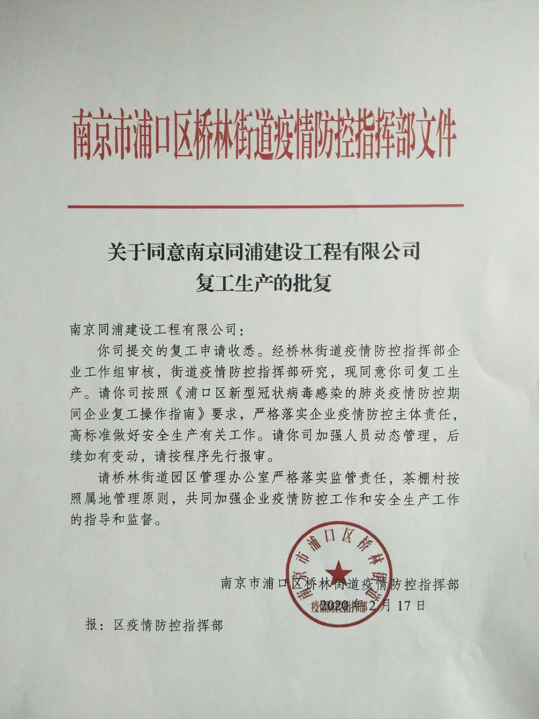 在同力建設(shè)領(lǐng)導(dǎo)的關(guān)心指導(dǎo)下,同浦公司魏強(qiáng)董事長(zhǎng)親任同浦公司防疫工作領(lǐng)導(dǎo)小組組長(zhǎng),同浦公司總經(jīng)理徐雪華任副組長(zhǎng),自2月2日起,按照屬地政府橋林街道園區(qū)辦的復(fù)工政策要求,全面組織準(zhǔn)備各項(xiàng)防疫物資、復(fù)工申報(bào)材料,2月10日正式提交復(fù)工申請(qǐng)。經(jīng)多方努力跟進(jìn),2月17日,同浦公司取得復(fù)工批復(fù),為茶棚工業(yè)園區(qū)第一家復(fù)工企業(yè)。